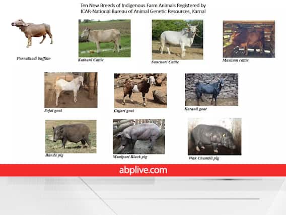 देसी पशुधन की 10 नई नस्लेंआईसीएआर-एनबीएजीआर की ओर से रजिस्टर की गई पशुधन की देसी नस्लों में महाराष्ट्र की कथानी गाय, राजस्थान की सांचोरी गाय, मेघालय की मासीलम गाय, महाराष्ट्र की पूर्णनाथी भैंस, राजस्थान की सोजत बकरी, राजस्थान की करौली बकरी, राजस्थान की गुजरी बकरी, झारखंड का बांदा सूअर, मणिपुर का मणिपुरी काला सूअर और मेघालय का वाक चंबल सूअर शामिल है. जानकारी के लिए बता दें कि देश में पशुधन (Indian Livestock) की देसी नस्लों की कुल संख्या 212 है, जिसमें 53 गोवंश, 20 भैंस, 37 बकरी, 44 भेड़, 7 घोड़े और टट्टू, 9 ऊंट, 13 गधे, 3 कुत्ते, 1 याक, 19 चिकन, 2 बतख और 3 हंस हैं.