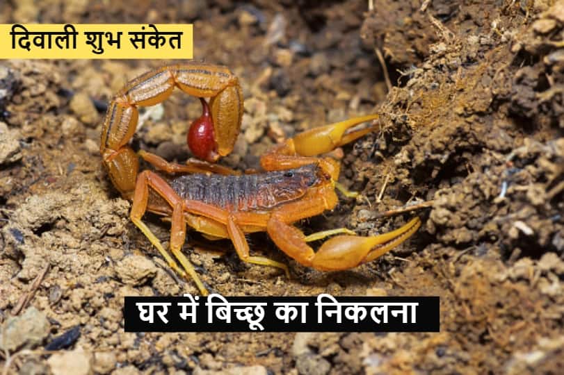 पीले रंग का बिच्छूदिवाली के समय यदि घर में पीले रंग का बिच्छू दिख जाए तो ये बहुत ही शुभ संकेतों में से एक है. इसका अर्थ ये है कि आने वाले समय में आय में वृद्धि और बिजनेस में लाभ होने वाला है. ये जॉब में प्रमोशन का भी संकेत हो सकता है. धन संबंधी समस्याओं के दूर होने का भी प्रबल संकेत माना गया है. शास्त्रों में बिच्छू को माया का प्रतीक माना गया है. मान्यता है कि बिच्छू घर में निकले तो ये धन की देवी लक्ष्मी जी के आगमन का शुभ संकेत होता है.