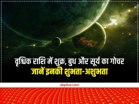 पंचांग के अनुसार, सूर्य देव 16 नवंबर को शाम 7 बजकर 15 मिनट पर वृश्चिक राशि में प्रवेश करेंगे. जहां पर शुक्र और बुध पहले से विराजमान रहेंगे. ऐसे में इन 3 प्रमुख ग्रहों का वृश्चिक राशि में गोचर बेहद खास होगा.