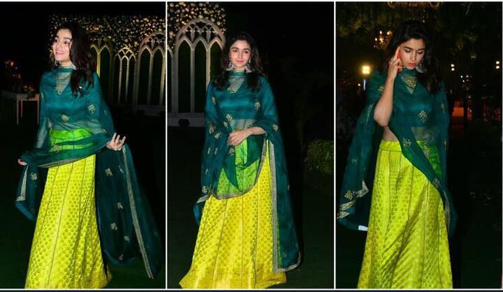 आलिया ने पीले और हरे रंग का लहंगा चोली पहना था. इस लहंगे को आलिया ने हैवी ईयररिंग्स के साथ टीमअप किया था.