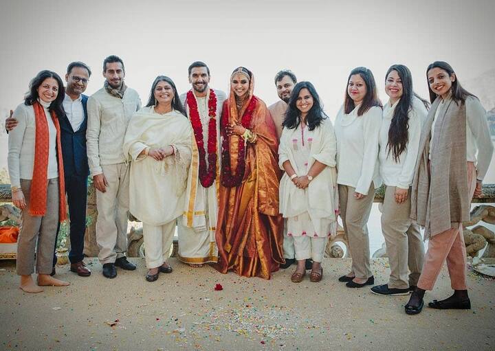 इनकी शादी के बाद की ये तस्वीर भी सामने आई है. ये शादी के बाद हुए सेलिब्रेशन के दौरान क्लिक की गई है. इस तस्वीर में रणवीर-दीपिका के साथ उनके करीबी भी दिखाई दे रहे है. तस्वीर में आप देख सकते हैं कि जहां दीपिका पादुकोण ब्लैक कलर के हैवी सूट में दिखाई दे रही हैं. वही रणवीर सिंह मैंगो ग्रीन कलर के कुर्ता पजामा और जैकेट में दीपिका के साथ हंसते नजर आ रहे हैं.