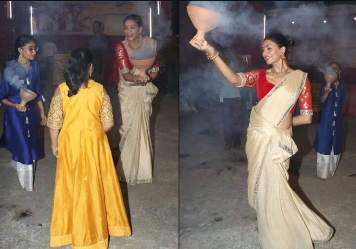 बॉलीवुड अभिनेत्री सुष्मिता सेन बीती रात मुंबई में अपनी बेटियों रिनी और अलिसाह के साथ दुर्गा पूजा पंडाल पहुंचीं. इस दौरान उन्होंने अपनी बेटियों के साथ वहां पारंपरिक धुनुची डांस भी किया. सुष्मिता सेन की ये तस्वीरें जमकर वायरल हो रही हैं. (तस्वीर: मानव मंगलानी)