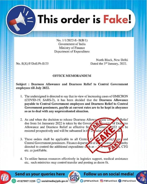 DA Hike Update: सोशल मीडिया ( Social Media ) में लगातार एक खबर वायरल ( Viral News) हो रही है. इस खबर में वित्त मंत्रालय ( Ministry Of Finance ) के डिपार्टमेंट ऑफ एक्सपेंडिचर ( Departament of Expenditure ) द्वारा जारी किया गया एक पत्र वायरल किया जा रहा है. इस पत्र ( Office Memorundum) में लिखा है कि कोरोना वायरस ( Covid 19) के नए वैरिएंट ओमिक्रोन ( Omicron) के चलते केंद्रीय कर्मचारियों ( Central Government employees ) का महंगाई भत्ता ( Dearness Allowance) और केंद्र सरकार के पेंशनर्स ( Central Government Pensioners) को दिए जाने वाले महंगाई राहत ( Dearness Relief ) के फैसले को तात्कालिक हालात से निपटने के लिए टाल दिया गया है. लेकिन पीआईबी ( PIB) ने इस खबर का फैक्टचेक किया है और इस खबर को फर्जी और फेक करार दिया है.