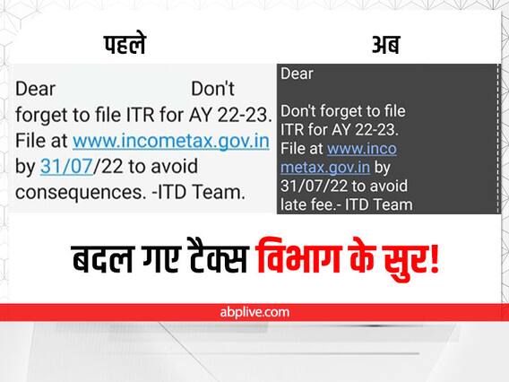 बदल गए सुर दरअसल बीते हफ्ते ही हमने आपको टैक्स विभाग के धमकी भरे लहजे वाले एसएमएस के बारे में बताया था जिसे लेकर सोशल मीडिया पर टैक्स विभाग की भारी खिंचाई हुई थी. पहले कई टैक्सपेयर्स के पास जो मैसेज आए उसमें लिखा था कि "प्रिय (पैन नंबर) अंजाम भुगतने से बचने के लिए एसेसमेंट ईयर 2022-23 के लिए www.incometax.gov.in पर 31 जुलाई, 2022 से पहले आयकर रिटर्न दाखिल भरना ना भूलें." लेकिन अब जो टैक्स विभाग टैक्सपेयर्स के पास मैसेज भेज रहा है उसमें लिखा है "प्रिय (पैन नंबर) लेट फीस देने से बचने के लिए एसेसमेंट ईयर 2022-23 के लिए www.incometax.gov.in पर 31 जुलाई, 2022 से पहले आयकर रिटर्न दाखिल भरना ना भूलें."