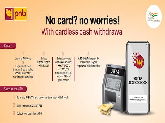पीएनबी के एटीएम से कार्डलेस कैश विड्रॉल करने का तरीका-1. सबसे पहले PNB ONE ऐप में करें लॉगिन.2. आगे कार्डलेस कैश विड्रॉल ऑप्शन सेलेक्ट करें.3. इसके बाद आप 1,000 रुपये से लेकर 10,000 रुपये तक की कोई भी निकाली राशि डालें.4. इसके बाद आपको Registered Mobile Number पर 12 अंक का Reference ID भेजी जाएंगी.5. इसके बाद अपने घर के पास के किसी भी पीएनबी के एटीएम में जाएं.6. इसके बाद वहां कार्डलेस कैश विड्रॉल ऑप्शन का चुनाव करें.7. इसके बाद आगे Reference ID और TPIN दर्ज करें.8. आपका कैश विड्रॉल आसानी से हो जाएगा.