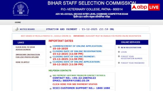 बिहार स्टाफ सेलेक्शन कमीशन की ओर से इंटर लेवल भर्ती परीक्षा 2025 के लिए आवेदन करने वाले उम्मीदवारों के लिए आज का दिन बहुत जरूरी है. दरअसल आयोग ने साफ कर दिया है कि इस भर्ती के लिए रजिस्ट्रेशन और आवेदन शुल्क जमा करने की लास्ट डेट आज है. ऐसे में जो उम्मीदवार आज फीस जमा कर देंगे वह 18 दिसंबर 2025 तक अपना फाइनल ऑनलाइन आवेदन सबमिट कर सकते हैं.