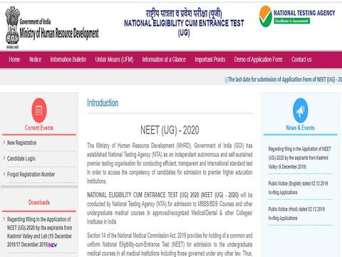 नई दिल्ली: नेशनल टेस्टिंग एजेंसी ( NTA) ने नीट 2020 परीक्षा के लिए रजिस्ट्रेशन (Registration) की अंतिम तिथि 6 जनवरी, 2020 तक बढ़ा दी है. जिन उम्मीदवारों ने अभी भी परीक्षा के लिए अपना रजिस्ट्रेशन नहीं कराया है, वे NTA NEET की आधिकारिक साइट ntaneet.nic.in पर जाकर आवेदन कर सकते हैं. बता दें कि आवेदन प्रक्रिया 2 दिसंबर, 2019 को शुरू हुई थी और इससे पहले अंतिम तारीख 31 दिसंबर, 2019 तक थी. अंतिम तिथि के विस्तार के साथ, फीस पेमेंट की तारीख भी बढ़ाई जाएगी. जो उम्मीदवार राष्ट्रीय पात्रता सह प्रवेश परीक्षा, NEET 2020 के लिए आवेदन करना चाहते हैं, वे नीचे दिए गए इन सरल चरणों का पालन कर सकते हैं.