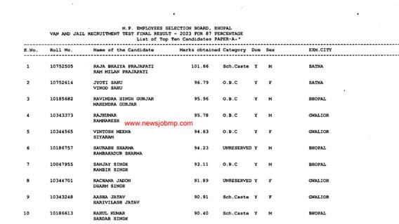 दरअसल, मध्य प्रदेश कर्मचारी चयन बोर्ड ने किया है. बोर्ड की तरफ से वन और जेल भर्ती परीक्षा का अंतिम रिजल्ट जारी किया गया है. बोर्ड की तरफ से जारी रिजल्ट में एक कैंडिडेट को 101.66 नंबर दिए गए हैं. जिस कैंडिडेट को 101 से ज्यादा नंबर मिले हैं उसका नाम राजा भैया प्रजापति है. राजा भैया प्रजापति के बाद दूसरे स्थान पर ज्योति साहू का नाम है 96.79 अंक मिले हैं.