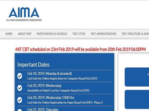 नई दिल्ली: मैनेजमेंट एप्टिट्यूड टेस्ट (मैट) एग्जाम के लिए ऑल इंडिया मैनेजमेंट एसोसिएशन (एआईएमए) आज शाम छह बजे एडमिट कार्ड जारी करेगा. एडमिट कार्ड एआईएमए की आधिकारिक वेबसाइट https://mat.aima.in/feb19/ पर अपलोड किया जाएगा. हालांकि, शाम के छह बजे तक एडमिट कार्ड जारी नहीं किया गया है.