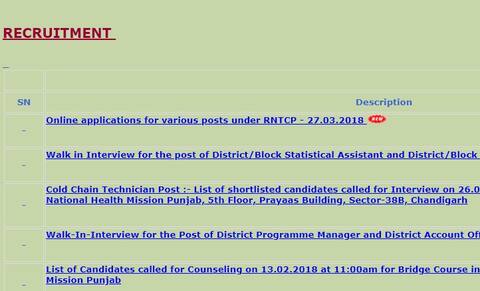 NHM Punjab Recruitment 2018: नेशनल हेल्थ मिशन पंजाब ने नई नौकरियों के लिए ऑनलाइन एप्लिकेशन मंगवाए हैं. कैंडिडेट्स को एप्लिकेशन ऑफिशियल वेबसाइट http://pbnrhm.org/career1.aspx पर अप्लाई करने होंगे. ये एप्लिकेशन माइक्रोबायोलॉजिस्ट (IRL), सीनियर लेब टेक्निशियन, सीनियर डॉट्स प्लस और टीबी एचवी सुपरवाइजर, सीनियर टीबी सुपरवाइजर, सीनियर ट्रीटमेंट सुपरवाइजर, टीबी हेल्थ विजिटर की पोस्ट के लिए हैं.
