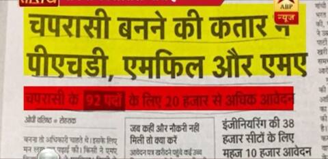 कॉन्ट्रैक्ट चपरासी की भर्तियों के लिए आए पीएचडी, एमफिल और एमए कर चुके लोगों के आवेदन आज फिर अखबार में हरियाणा की खबर छपी कि महर्षि दयानंद विश्वविद्यालय में कॉन्ट्रैक्ट पर चपरासी की 92 भर्तियों के लिए पीएचडी, एमफिल और एमए कर चुके 20 हजार लोगों ने फॉर्म भरा है. फॉर्म खरीदने के लिए एक किलोमीटर लंबी लाइन लगी थी. दो पुरानी और आज की खबर बताती है कि देश में नौकरी का संघर्ष जारी है. इसके बाद भी कि पीएम मोदी ने 3 साल पहले 2 करोड़ नौकरी देने का वादा किया था.