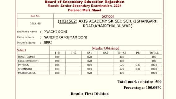 Rajasthan Board 12th Result 2024: राजस्थान बोर्ड ने 12वीं कक्षा का परीक्षा परिणाम जारी किया. इस साल 96 प्रतिशत से अधिक छात्र पास हुए हैं. छात्राओं का पासिंग प्रतिशत 98.90 प्रतिशत रहा है जबकि 97.08 फीसदी लड़के पास हुए हैं. प्राची सोनी ने 12वीं कक्षा में पूरे राज्य से टॉप किया है. उन्हें 500 में से 500 अंक मिले हैं, जिनकी मार्कशीट भी वायरल हो रही है. दूसरे स्थान पर तरुणा चौधरी हैं और तीसरे स्थान पर प्रियंका गुर्जर रही हैं.