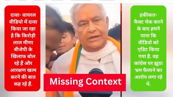 तथ्यों के जांच के हाद हमने वायरल वीडियो को अधूरा पाया है, जिसमें से एक हिस्से को काट कर झूठ फैलाया जा रहा है. मूल वीडियो में बीजेपी नेता किरोड़ी लाल मीणा ने संविधान पर कांग्रेस के लिए, ये कहा था कि कांग्रेस लोगों में भ्रम फैला रही है कि, अगर मोदी जी 400 पार करेंगे तो आरक्षण को खत्म करेंगे और संविधान को भी बदल देंगे. ऐसे में साबित होता है कि मीणा के अधूरे बयान को गलत संदर्भ से शेयर किया गया है.