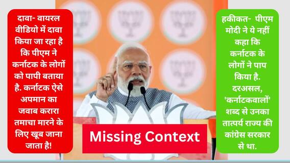 फैक्ट को देखने के बाद साफ होता है कि पीएम मोदी ने "कर्नाटक वालों" कहकर कर्नाटक के लोगों का जिक्र नहीं किया, बल्कि वह राज्य की कांग्रेस सरकार की आलोचना कर रहे थे. वायरल वीडियो को काट-छांट कर गायब संदर्भ के साथ साझा किया गया है.