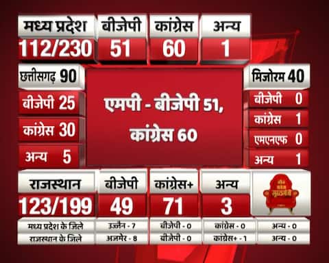 मध्य प्रदेश में भी कांग्रेस के लिए खुशी ही खुशी है. रुझानों में यहां भी कांग्रेस ने बहुमत हासिल कर लिया है, लेकिन बीजेपी की तरफ से कांटे की टक्कर मिल रही है और लगातार आंकड़े बदल रहे हैं. माना जाता है कि जिस तरह से आंकड़े बदल रहे हैं और जो रुझान बीते दो घंटे में रहा है उससे जाहिर होता है कि यहां भी कांग्रेस सरकार बना सकती है.