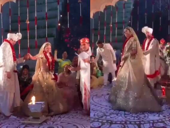 अंकिता की शादी के लेटेस्ट वीडियो में एक्ट्रेस ने विक्की जैन का हाथ बड़े प्यार से थामा हुआ है और वो दोनों अग्नि के सात फेरे लेते हुए दिख रहे हैं. गोल्डन लहंगे में सजी अंकिता के चेहरे से नजर हटाना तक मुश्किल हो रहा है. विक्की जैन लगातार उनके लहंगे को संभाल रहे हैं. शादी को लेकर दोनों की एक्साइटमेंट देखते ही बन रही है. फेरे के दौरान उस वक्त अचानक सबको जोश हाई हो जाता है जब विक्की मंडप पर ही हाथ उठाकर नाचना शुरू कर देते हैं. उनका मंडप काफी खूबसूरत तरीके से सजाया गया है. चारों तरफ लाल और सफेद रंग के फूलों की मालाओं से सजावट नजर आ रही हैं.