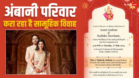 इस सामूहिक विवाह कार्यक्रम से जुड़ा एक कार्ड सामने आया है जिसमें जानकारी दी गई है कि वंचित लोगों की शादी का कार्यक्रम अनंत अंबानी और राधिका मर्चेन्ट की प्री वेडिंग का हिस्सा है. इसमें बताया गया है कि यह सामूहिक विवाह समारोह महाराष्ट्र के पालघर जिले में मंगलवार, 2 जुलाई 2024 को शाम साढ़े चार बजे से रखा गया है.