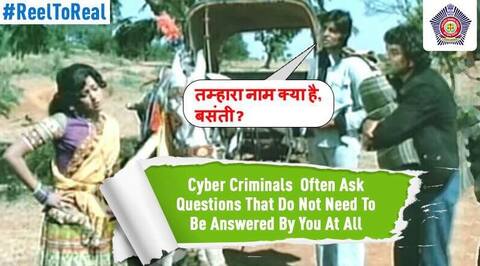 अपने ताजा ट्वीट में मुंबई पुलिस ने अमिताभ के डायलोग वाली तस्वीर शेयर की. तस्वीर में अमिताभ बच्चन (जय), धर्मेंद्र (वीरू) और हेमा मालिनी (बसंती) दिखाई दे रही है. इस तस्वीर के जरिए साइबर क्राइम को लेकर लोगों को जागरुक किया जा रहा है. इस तस्वीर के जरिए यह संदेश दिया जा रहा है कि आप अपनी अंजान लोगों के साथ शेयर ना करें.