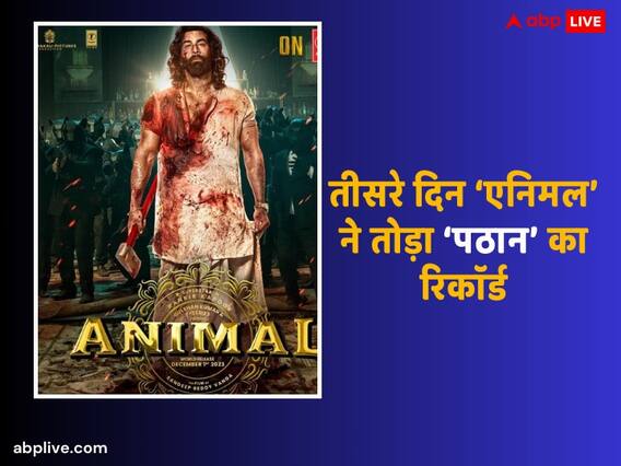 Animal Box Office Collection Day 3: रणबीर कपूर की फिल्म 'एनिमल' का क्रेज ऑडियंस के सिर चढ़कर बोल रहा है. फिल्म को ओपनिंग डे से ही बॉक्स ऑफिस पर शानदार रिस्पॉन्स मिल रहा है. इसी के साथ ये फिल्म कईं ब्लॉकबस्ट फिल्मों के रिकॉर्ड भी ब्रेक करती जा रही है. यहां तक कि 'एनिमल' ने रिलीज के तीसरे दिन वर्ल्डवाइड शाहरुख खान की मेगा ब्लॉकबस्टर फिल्म पठान का भी रिकॉर्ड ब्रेक कर दिया है.