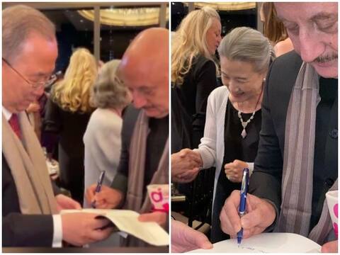 संयुक्त राष्ट्र के पूर्व महासचिव बान की-मून ने अनुपम खेर से उनकी आत्मकथा पर हस्ताक्षर करने का अनुरोध किया. भारतीय अभिनेता इससे रोमांचित हुए. अभिनेता अनुपम खेर ने ट्विटर पर एक वीडियो साझा किया है, जिसमें वह बान की-मून को ऑटोग्राफ (हस्ताक्षर) देते दिखाई दे रहे हैं. इस वीडियो को अभी तक 20.3 हजार लोग देख चुके हैं.