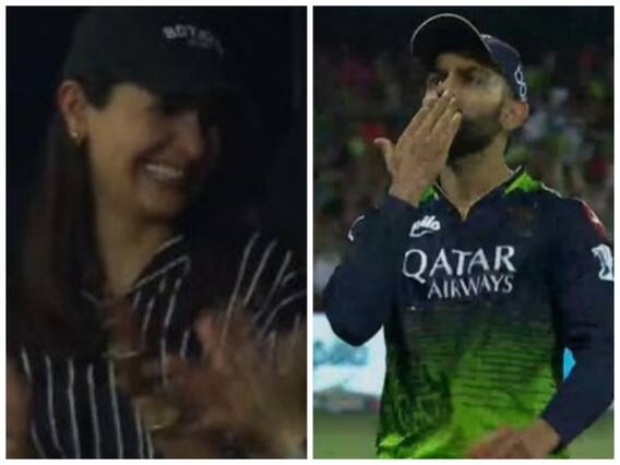 Virat Kohli Flying Kiss To Anushka Sharma: बॉलीवुड एक्ट्रेस अनुष्का शर्मा (Anushka Sharma) रविवार को आईपीएल मैच (IPL 2023) के दौरान पति विराट कोहली (Virat Kohli) को सपोर्ट करने के लिए एम चिन्नास्वामी स्टेडियम पहुंचीं. विराट कोहली की टीम रॉयल चैलेंजर्स बेंगलुरु, राजस्थान रॉयल्स के खिलाफ मैदान में उतरी. इस मैच के दौरान विराट कोहली ने कुछ ऐसा किया कि पत्नी अनुष्का शर्म से लाल हो गईं.