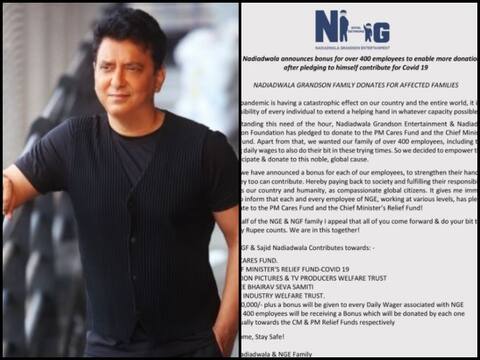 साजिद ने कहा, ''मुझे यह बताते हुए बहुत गर्व हो रहा है कि विभिन्न स्तरों पर काम कर रहे नाडियाडवाला ग्रैंडसन एंटरटेनमेंट के प्रत्येक कर्मचारी ने पीएम केयर्स फण्ड और मुख्यमंत्री राहत कोष में दान करने का संकल्प लिया है. नाडियाडवाला ग्रैंडसन एंटरटेनमेंट और नाडियाडवाला ग्रैंडसन फाउंडेशन के परिवार की ओर से मैं अपील करता हूं कि आप सभी आगे आएं और अपना योगदान दे क्योंकि ऐसे में प्रत्येक रुपया मायने रखता है. हम सब इसमें एकसाथ हैं.''
