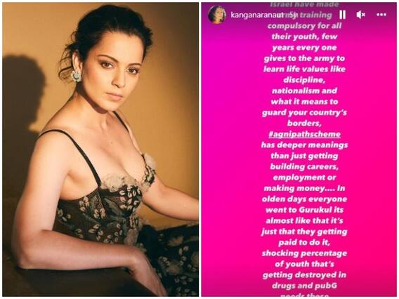Kangana Ranaut On Agneepath Scheme: बॉलीवुड अभिनेत्री कंगना रनौत (Kangana Ranaut) ने शनिवार को सशस्त्र बलों (Armed Forces) में भर्ती के लिए नई अग्निपथ योजना (Agneepath Scheme) के समर्थन में आवाज उठाई और उन्होंने "इन पहलों के लिए सरकार की सराहना की". कंगना रनौत ने अपने इंस्टाग्राम अकाउंट पर एक स्टोरी पोस्ट की और लिखा, "इजराइल जैसे कई देशों ने अपने सभी युवाओं के लिए सेना प्रशिक्षण अनिवार्य कर दिया है, कुछ साल हर कोई सेना को अनुशासन, राष्ट्रवाद और इसका क्या अर्थ है जैसे जीवन मूल्यों को सीखने के लिए देता है. अपने देश की सीमाओं की रक्षा के लिए, #agneepathscheme का अर्थ केवल करियर बनाना, रोजगार प्राप्त करना या पैसा कमाना है."