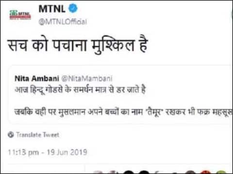 नई दिल्ली: सरकारी दूरसंचार कंपनी एमटीएनएल (महानगर टेलीफोन निगम लिमिटेड) के आधिकारिक ट्विटर हैंडल से एक ऐसा ट्वीट किया गया, जिसे देखकर सभी हैरान रह गए. नीता अंबानी नाम की एक यूज़र ने ट्विटर पर लिखा, "आज हिंदू गोडसे के समर्थन मात्र से डर जाते हैं, जबकि वहीं पर मुसलमान अपने बच्चों का नाम 'तैमूर' रखकर फख्र महसूस करते हैं." इसी ट्वीट को रीट्वीट करते हुए एमटीएनएल ने लिखा, "सच को पचा पाना मुश्किल है." सरकारी दूरसंचार कंपनी एमटीएनएल के आधिकारिक हैंडल से इस विवादित ट्वीट के होने के बाद सोशल मीडिया पर लोग इसकी आलोचना करने लगे. एक यूज़र ने लिखा, "और अब आपको अपनी नौकरी बचाना भी मुश्किल हो जाएगा भक्त महोदय." आलोचना होते देख अब इस ट्वीट को एमटीएनएल के ट्विटर हैंडल से हटा लिया गया है. एमटीएनएल के इस ट्वीट का जवाब देते हुए दीप प्रकाश पंत नाम के एक यूज़र ने लिखा, "ट्वीट करने से पहले बीजेपी आईटी सेल का कोई शख्स ट्विटर हैंडल बदलना भूल गया." जबकि एक दूसरे यूज़र ने दूरसंचार मंत्री रविशंकर प्रसाद को टैग करते हुए एमटीएनएल को जवाब में लिखा, "एमटीएनएल को भी बीजेपी ट्रोल चला रहे हैं रविशंकर प्रसाद ये क्या है." आपको बता दें कि राष्ट्रपिता महात्मा गांधी की हत्या करने वाले नाथूराम गोडसे को लेकर पिछले दिनों काफी विवाद हुआ था. इसके अलावा सैफ अली खान और करीना खान के बेटे तैमूर अली खान के नाम को लेकर भी एक वक्त पर जमकर विवाद हो चुका है.