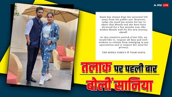 सानिया मिर्जा की फैमिली ने एक ऑफिशियल स्टेटमेंट जारी करते हुए सोशल मीडिया पर पोस्ट किया है. सानिया के पिता इमरान मिर्जा ने जो पोस्ट किया है इसमें लिखा है- 'सानिया ने अपनी निजी जिंदगी को हमेशा लोगों की नजरों से दूर रखा है. हालांकि, आज उन्हें यह बताने की जरूरत पड़ गई है कि शोएब और उनका तलाक हुए कुछ महीने हो गए हैं. वह शोएब को उनके नए सफर के लिए शुभकामनाएं देती हैं!'