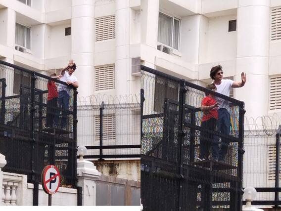 जब शाहरुख फैंस से मिलने के लिए बाहर आए तो उनके साथ छोटा बेटा अबराम भी था. इस दौरान शाहरुख कैजुअल लुक में नजर आए. उन्होंन व्हाइट टी-शर्ट के साथ ब्लू कारगो पैंट पहना था. वहीं अबराम रेड टी-शर्ट के साथ डेनिम में नजर आए. अबराम ने भी शाहरुख के साथ फैंस को वेव किया.शाहरुख और अबराम की ये तस्वीर वायरल हो गई है.