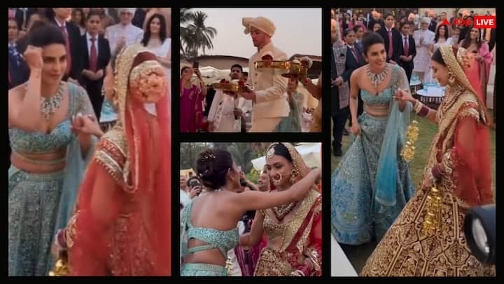 भाभी की मदद करती दिखीं प्रियंका चोपड़ानीलम उपाध्याय ने अपनी शादी के लिए मरून कलर का ब्राइडल आउटफिट चुना था. इसके साथ उन्होंने लंबा-सा घूंघट लेकर मंडप पर एंट्री ली. इस दौरान प्रियंका उनका घूंघट सही करती नजर आईं. प्रियंका ने फोटो और वीडियो के लिए अपनी भाभी का लहंगा और दुपट्टा सही किया. इसके बाद मंडप पर चढ़ने में दुल्हन का हाथ पकड़कर उनकी मदद भी करती दिखाई दीं.