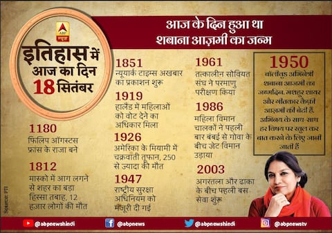 Today in History, 18th September: बॉलीवुड अभिनेत्री शबाना आजमी का जन्मदिन. मशहूर शायर और गीतकार कैफ़ी आज़मी की बेटी हैं. अभिनय के साथ-साथ हर विषय पर खुल कर बात करने के लिए जानी जाती हैं.