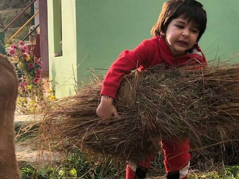 करीना कपूर ने वीडियो के साथ एक तस्वीर भी शेयर करने के साथ एक नोट भी शेयर किया है. इस तस्वीर में तैमूर एक गाय के बछड़े के लिए चारा उठाते हुए नजर आ रहे हैं. उनके चेहरे पर चारे का भार उठाने वाले भाव साफ दिखाई दे रहे हैं. इस पोस्ट में उन्होंने अपने बेटे को खास अंदाज में जन्मदिन की शुभकामनाएं दी हैं. उन्होंने लिखा,"मेरे बच्चे... मुझे खुशी है कि चार साल की उम्र में आपमें वह दृढ़ संकल्प, समपर्ण और एकाग्रता है उन चीजों में जो भी आप करना चाहते हैं. जब आप घास उठाकर गाय को खिला रहे हैं."
