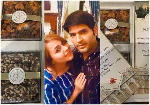 कपिल के शादी के कार्ड की बात करें तो इसे बेहद शानदार तरीके से डिजाइन किया गया है. इस वेडिंग इंवीटेशन को तीन हिस्सों में बांटा गया है. जिसे अंदर से मिठाईयों और इंवीटेंशन कार्ड से सजाया हुआ है. इसके साथ ही कपिल और गिन्नी के नाम के इनिशियल्स gk को भी जोड़ा गया है.