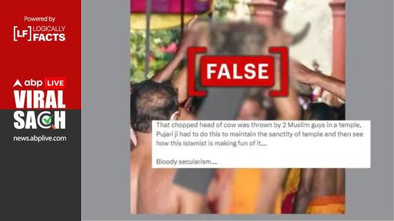 सोशल मीडिया पर एक तस्वीर वायरल हो रही है जिसमें एक व्यक्ति को एक गाय का कटा हुआ सिर पकड़े हुए दिखाया गया है. इस तस्वीर के साथ दावा किया जा रहा है कि वह एक पुजारी है और वह एक गाय का सिर दिखा रहा है जिसे मुस्लिम समुदाय के दो लोगों ने मंदिर में फेंक दिया था.