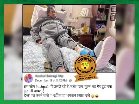 फेसबुक यूजर Anshul Bairagi Mp (Archive Link) ने वायरल तस्वीर को 11 दिसंबर को शेयर कर दावा किया, “हम लोग Pushpa2 में उलझे रहे है..उधर “लव-गुरू” का पैर टूट गया गुरु जी घायल है. देखभाल करने वाले स्टॉफ का भगवान ख्याल रखे.”