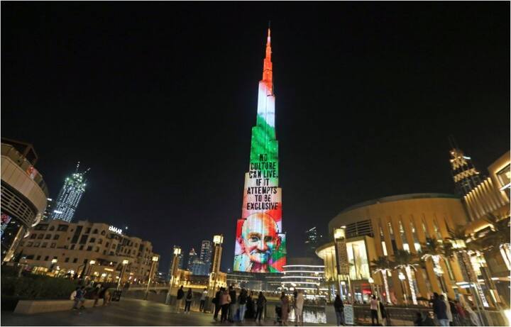 वहीं, इसका असर दुबई में बुर्ज खलीफा पर भी देखा गया. जहां, पूरी इमारत को तिरंगे और गांधी की तस्वीरों से सजाया गया था. फोटो-ट्विटर
