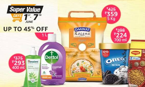 - डील @1 इसमें स्टॉक रहने तक सिर्फ 1 रुपये में 500 ग्राम सूजी या 500 ग्राम मैदा मिल रहा है. इस सेल में आटा, चावल , तेल और बाकी फूड आयटम पर 50% तक का डिस्काउंट मिल रहा है. इसमें 1 तरबूज या एक किलो आलू भी सिर्फ 1 रुपये में मिल रहे हैं.इस सेल फ्रेश फ्रूट्स एंड वेजीटेबल भी सबसे कम कीमत में मिल रही है साथ ही फ्री होम डिलीवरी है.