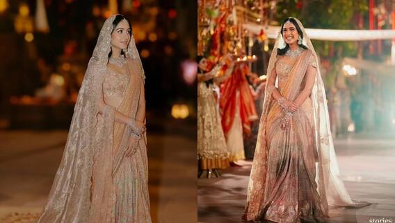 राधिका के लहंगे को स्पेशल फील देने के लिए इस पर हाथ से जरी-जरदोजी की जड़ाऊ कढ़ाई काफी बारीकी से की गई है. इसके अलावा इसमें कीमती स्टोन्स और स्वरोव्सकी का भी इस्तेमाल किया गया है. गोल्डन और ब्लश पिंक के इस साड़ी लहंगे में राधिका एक कम्पलीट दुल्हन जैसी दिखाई दीं.