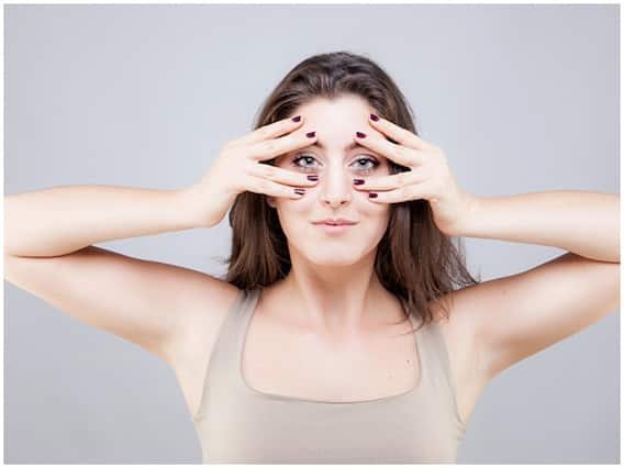 - आंखों की त्वचा को टाइट बनाने के लिए आप दोनों मध्यमा अंगुलियों को आईब्रो के भीतरी कोने पर एक साथ दबाएं.