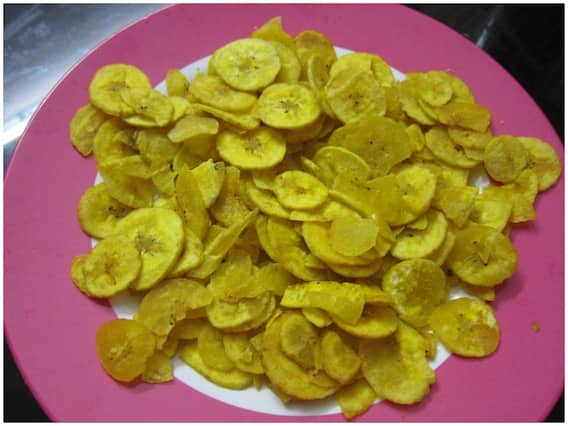 1- सबसे पहले इसके लिए आपको 2 सख्त और कच्चे पीले केले लेने होंगे. केले के चिप्स बनाते वक्त सही केले का चुनाव बहुत जरूरी है.2- अब इन केले में छिलके पर एक जैसी दूर पर हल्के स्लिट्स (light slits) बना दें. 3- अब केले के किनारे निकाल दें और धीरे से हाथ से छिलके को हटा दें. 4- अब एक बर्तन में नमक और 4 टेबल-स्पून पानी डालकर मिलाकर रखे लें. 5- एक नॉन स्टिक कढ़ाही में तेल गर्म करें, अब इसमें एक स्लाइसर से केले की स्लाइस करते हुए डाल दें.6- जब केले की स्लाइस 1-2 मिनट तक पक जाएं तो कढ़ाही में 1 टेबल-स्पून नमक-पानी का घोल डालकर मिला दें. अब इसे 1-2 मिनट तक पकने दें.7- अब आप मीडियम आचं पर कलछी से हिलाते हुए इन्हें कुरकुरा होने तक पकाएं. 8- जब तेल-पानी के छींटों की आवाज बंद हो जाए. एक टिशू पेपर पर केले के चिप्स निकाल लें.9- इसी तरह से सारे केले के चिप्स को आप तलकर ठंडा होने पर किसी एयरटाइट डब्बे में रख लें.10- चाय के साथ कुरकुरे केले के चिप्स का लुत्फ उठाएं.