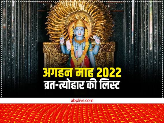 Margashirsha Month 2022, Vrat-Festival list 2022: 9 नंवबर से हिंदू पंचांग के नौवें महीने अगहन मास की शुरुआत हो चुकी है. इसकी समाप्ति 8 दिसंबर 2022 को होगी. इसे मार्गशीर्ष नाम से भी जाना जाता है. श्रीकृष्ण को भक्ति के लिए मार्गशीर्ष माह हिंदू धर्म में अति उत्तम माना गया है. इस मास का महत्व बताते हुए भगवान श्रीकृष्ण ने गीता में कहा है कि मार्गशीर्ष माह उनका ही स्वरूप है. विवाह, मुंडन, आदि मांगलिक कार्य के लिए ये महीना बहुत शुभ माना गया है. शास्त्रों के अनुसार इसी माह से सतयुग शुरू हुआ था. इस मास विवाह पंचमी, उत्पन्ना एकादशी, गीता जयंती सहित कई व्रत-त्योहार आएंगे. आइए जानते हैं मार्गशीर्ष महीने के व्रत-त्योहार की डेट.