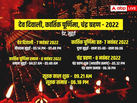 Kartik Purnima 2022, Dev diwali and Chandra Grahan: कार्तिक माह का आखिरी दिन 8 नवंबर को है. इस दिन पूर्णिमा है, हालांकि इस बार कार्तिक की पूर्णिमा दो दिन मनाई जाएगी. 7 और 8 नवंबर 2022 को कार्तिक पूर्णिमा का स्नान-दान, लक्ष्मी-नारायण पूजन किया जाएगा. इसे त्रिपुरारी पूर्णिमा भी कहा जाता है. कार्तिक पूर्णिमा पर दीपदान कर देव दिवाली मनाई जाती है.इस साल कार्तिक पूर्णिमा पर चंद्र ग्रहण भी लग रहा है आइए जानते हैं पूर्णिमा का स्नान कब होगा, देव दिवाली कब मनाई जाएगी और चंद्र ग्रह कब लग रहा है.