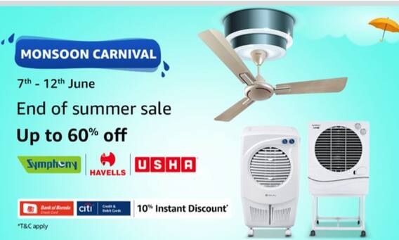 Fan Cooler Deal On Amazon: अमेजन मानसून सेल में फैन और कूलर पर एक से बढ़कर एक ऑफर चल रहा है. यहां से Symphony , Usha और Havells जैसे प्रीमियम ब्रांड के सबसे ज्यादा बिकने वाले फैन कूलर पर 60% तक की छूट मिल रही है. इसके अलावा Bank Of Baroda और Citi बैंक के कार्ड से पेमेंट करने पर 10% या 1,500 का कैशबैक है