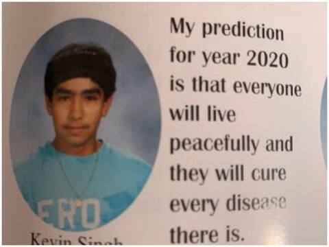 एक स्कूली छात्र केविन सिंह ने 2020 को लेकर 10 साल पहले भविष्यवाणी की थी. इस भविष्यवाणी को उसने अपने स्कूल की ईयरबुक में लिखा था. 2020 में हुई अकल्पनीय घटनाओं ने उस भविष्यवाणी को एक बार फिर चर्चा में ला दिया है. सोशल मीडिया प्लेटफॉर्मस पर ये वायरल है और लोग जमकर इस पर रिएक्शंस दे रहे हैं.