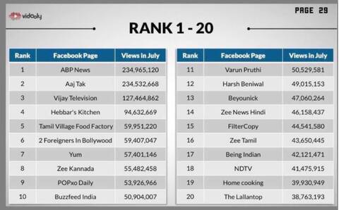 सोशल वीडियो एंटीलेजेंस क्रिएटर (सोशल मीडिया पर वीडियो रैंकिग जारी करने वाली एजेंसी) विडूली के मुताबिक जुलाई महीने में ABP न्यूज़ के फेसबुक पेज पर वीडियो व्यूज़ 234,965,120 रहा, जो सबसे ज्यादा है. दूसरे नंबर पर आजतक और तीसरे नंबर पर विजय टेलीविजन का फेसबुक पेज रहा.