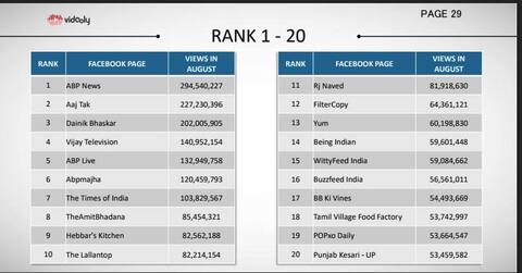 सोशल वीडियो एंटीलेजेंस क्रिएटर (सोशल मीडिया पर वीडियो रैंकिग जारी करने वाली एजेंसी) विडूली के मुताबिक अगस्त महीने में ABP न्यूज़ के फेसबुक पेज (facebook.com/abpnews/) पर वीडियो व्यूज़ 294,540,227 रहा, जो सबसे ज्यादा है. ये नंबर इतना ज्यादा है कि आपके भरोसेमंद चैनल ABP न्यूज के दूर-दूर तक कोई और फेसबुक पेज नहीं है.