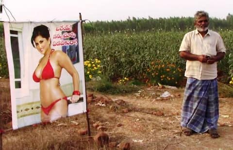 किसान ने फसल को बर्बाद होने से बचाने के लिए एक नहीं बल्कि सनी लियोनी की बिकीनी वाली दो फोटो खेत में लगाई हैं. इस पोस्टर पर तेलुगू में लिखा है, 'मुझसे जलना मत'.