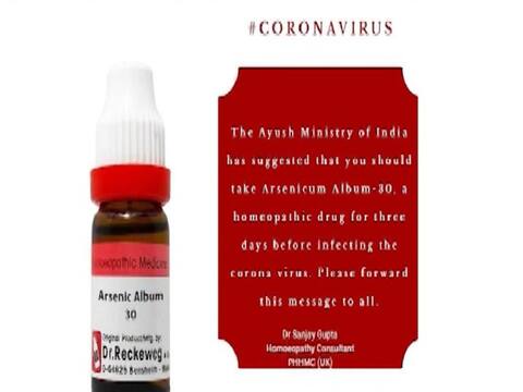 दावा है कि ये होम्योपैथी दवा कोरोना वायरस के खिलाफ सुरक्षा कवच बन सकती है. कोरोना वायरस के अटैक से बचा सकती है. दावे के मुताबिक सिर्फ तीन दिन तक इस दवा को लेने के बाद कोरोना वायरस कुछ नहीं बिगाड़ पाएगा. दवा का नाम आर्सेनिक एल्बम- 30 है.