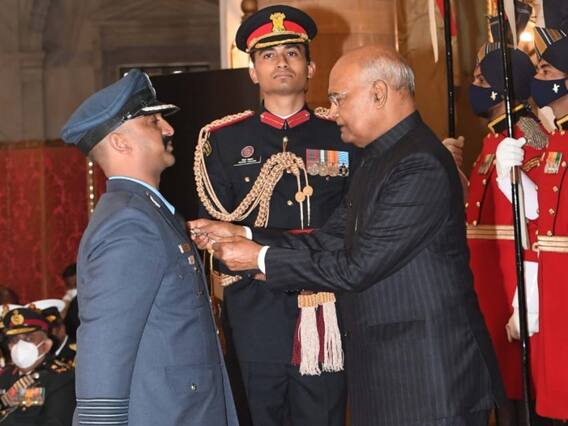Gallantry Awards 2021: बालाकोट एयर स्ट्राइक के बाद पाकिस्तान के एफ-16 फाइटर जेट को मार गिराने वाले विंग कमांडर (अब ग्रुप कैप्टन) अभिनंदन को सोमवार को वीर चक्र से नवाजा गया. राजधानी दिल्ली में आयोजित रक्षा अलंकरण समारोह में ग्रुप कैप्टन अभिनंदन को राष्ट्रपति रामनाथ कोविंद ने ये सम्मान दिया. सोमवार को राष्ट्रपति भवन में रक्षा अलंकरण समारोह का आयोजन किया गया. समारोह के दौरान राष्ट्रपति रामनाथ कोविंद ने सशस्त्र सेनाओं के वीर यौद्धाओं को वीरता मेडल से नवाजा. समारोह में ग्रुप कैप्टन अभिनंदन को वीर चक्र से नवाजा गया तो पूरा हॉल तालियों की गड़गड़ाहट से गूंज उठा.